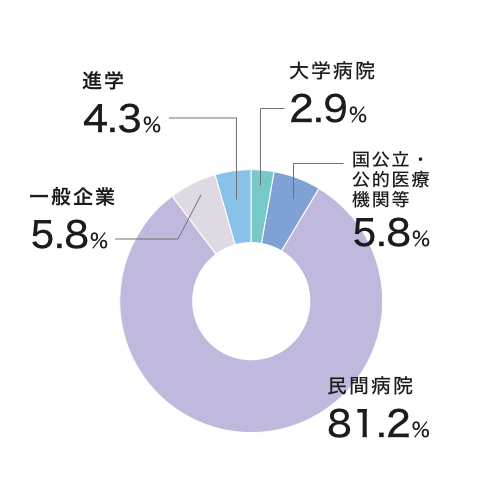- 就職説明会は本学で開催します。学生は直接求人担当者の方から、病院等の理念・特色や医療体制などについての説明を聞く場です。これらの説明から、志望就職先の病院・施設見学に臨みます。