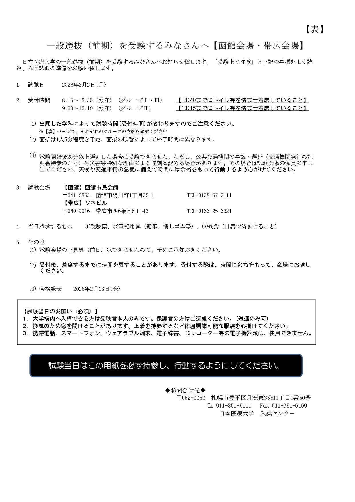 重要なお知らせ 2026.01.21 【重要】一般選抜(前期)を「函館会場」および「帯広会場」で受験されるみなさんへ 下記資料の内容をよく読み、入学試験の準備をお願いいたします。資料を印刷し、試験当日に持参をしてください。 一般選抜(前期)_函館会場・帯広会場のタイムスケジュール(試験当日)は、こちらから印刷してください。