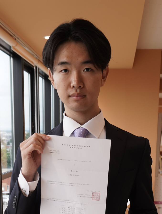 臨床工学科3年生(2期生) 浅井 悠佑君(札幌光星高校出身)が難関で知られる第1種ME技術実力検定試験に挑戦し、見事合格しました。