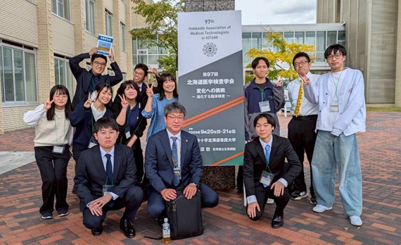 保健医療学部 臨床検査学科の4年生 7名(嶋 真杜さん、清田龍璽さん、永井 匠さん、柄澤昂希さん、鎌田 葵さん、小熊純怜さん、加藤妃夏さん)が、北海道の臨床検査技師の皆様が参加する学術集会である「第97回北海道医学検査学会」(北見市 令和7年9月20-21日)において、一般演題の口述発表を行いました。皆さん緊張しながらも堂々と、自分たちの研究をしっかり聴衆の方々に伝えてくれました。