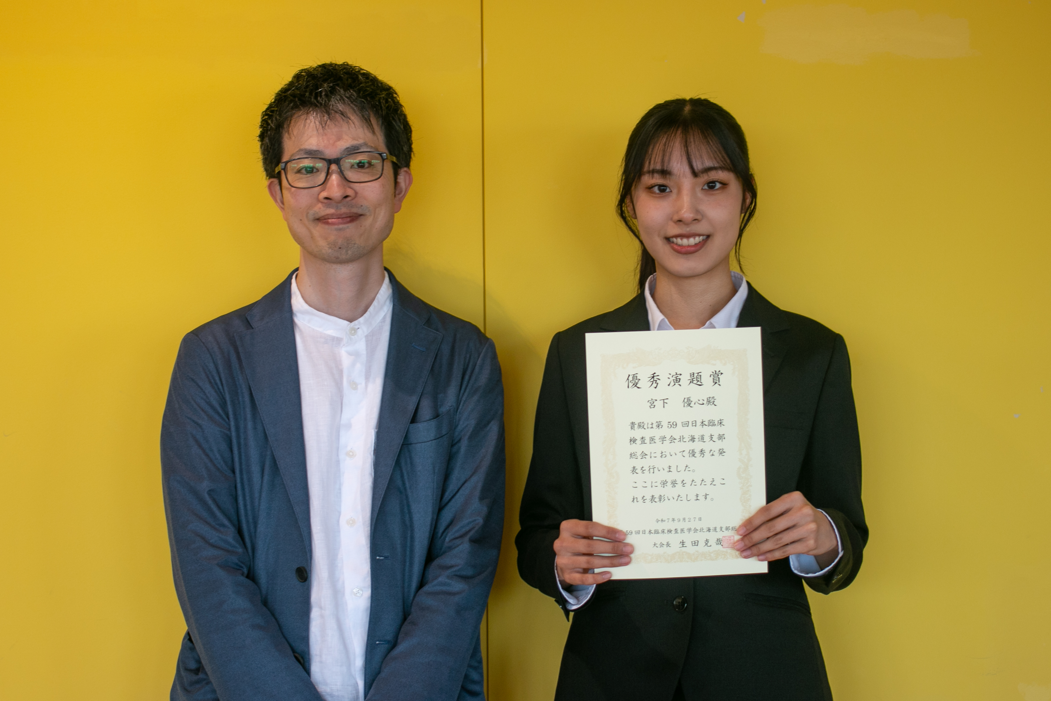 臨床検査学科 4 年の宮下優心さんが第 59 回日本臨床検査医学会北海道支部総会で優秀演題賞を獲得しました。おめでとうございます!