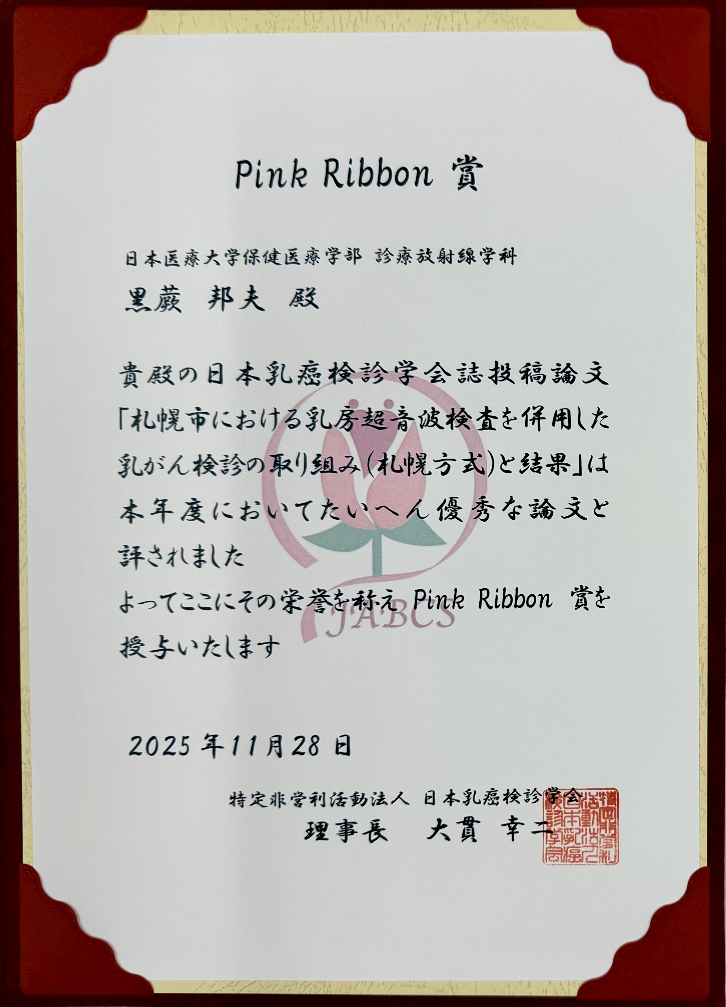 診療放射線学科の黒蕨准教授が日本乳癌検診学会からピンクリボン賞を受賞しました