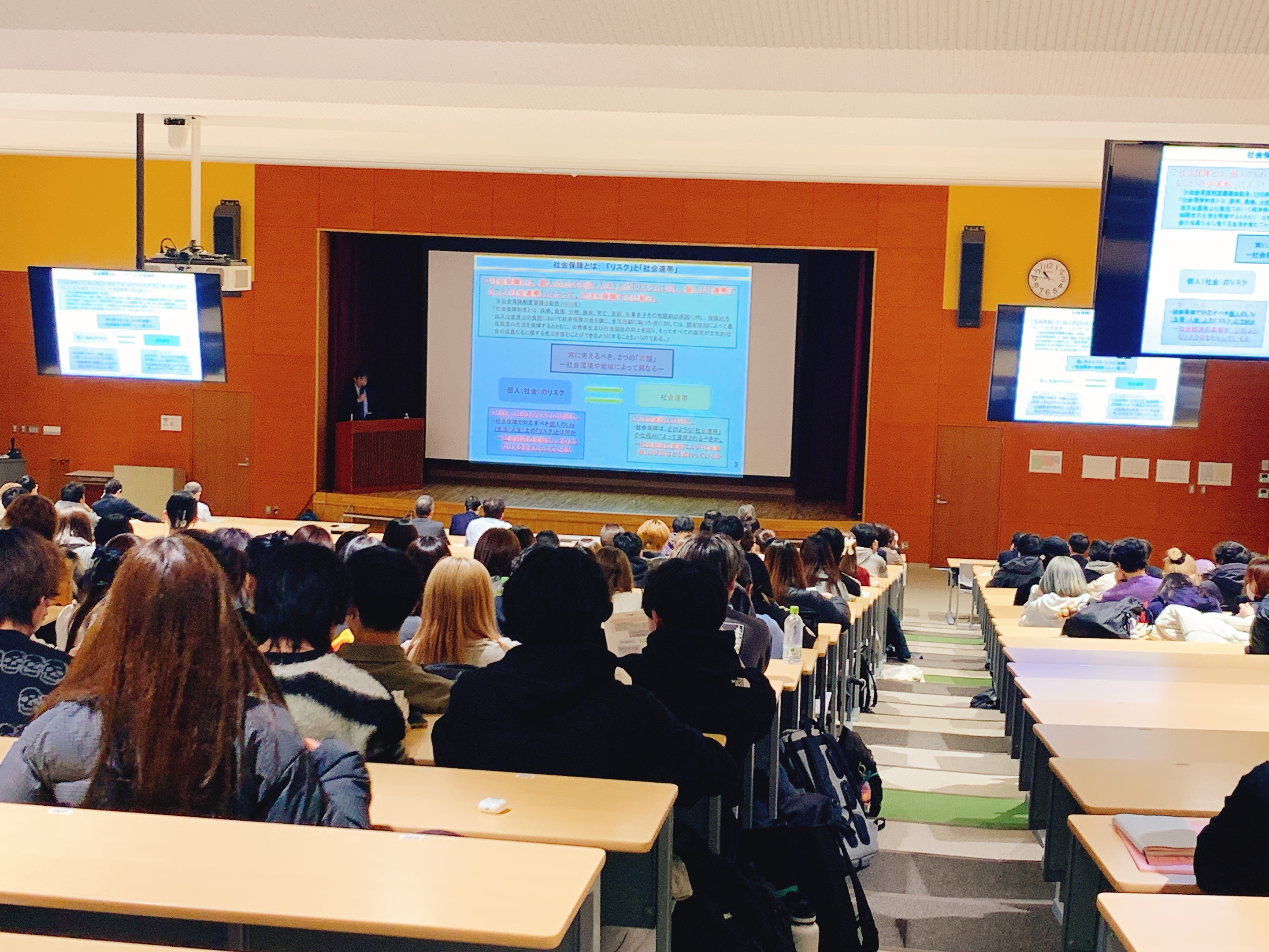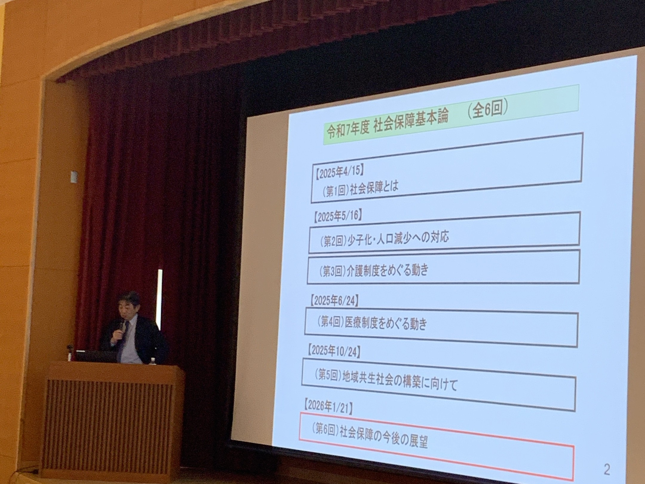 NEWS おしらせ 2026.01.30 山崎史郎客員教授による今年度最後の特別講義が開催されました 2026年1月21日(水)、日本医療大学大講堂にて山崎史郎客員教授による特別講義が開催されました。 この特別講義は1年間を通して計6回にわたり「社会保障基本論」と題し、少子化や人口減少と社会保障、医療制度などの関連についてお話しいただいています。 今回のテーマは、第6回目「社会保障の今後の展望」でした。今年度の総まとめとして、今後の日本の社会保障の展望について、新たな知見も交えてご講演いただきました。 また、講義の最後には、山崎史郎客員教授から試験を控える学生へエールが送られました。