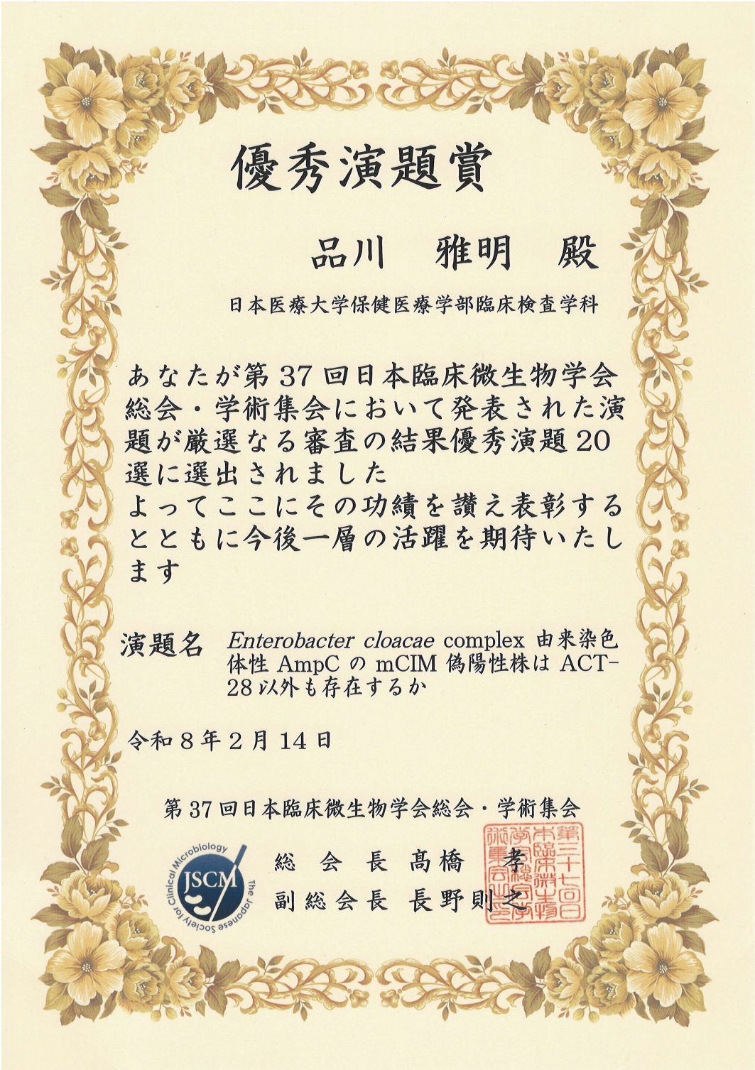 臨床検査学科の品川学科長が第37回日本臨床微生物学会総会・学術集会において優秀演題賞を受賞されました
