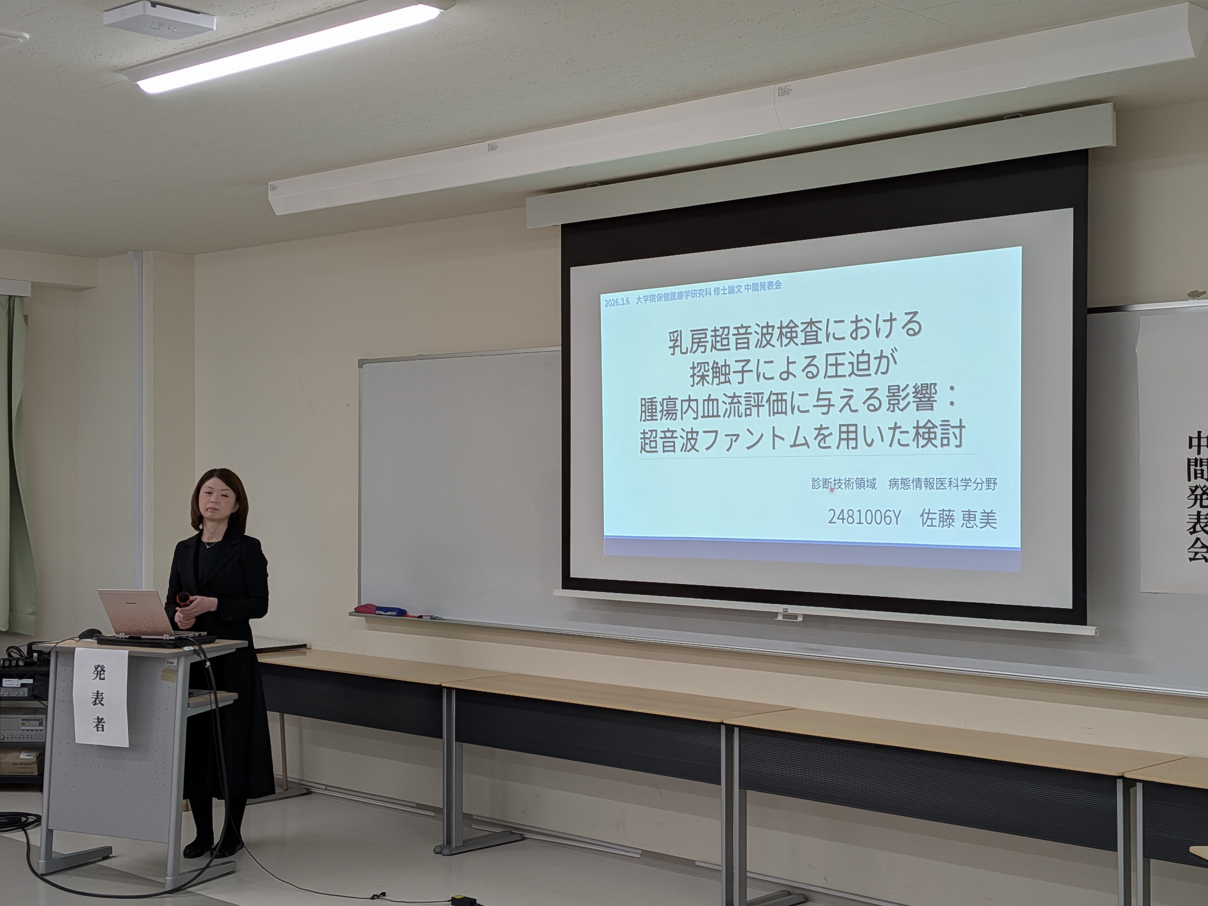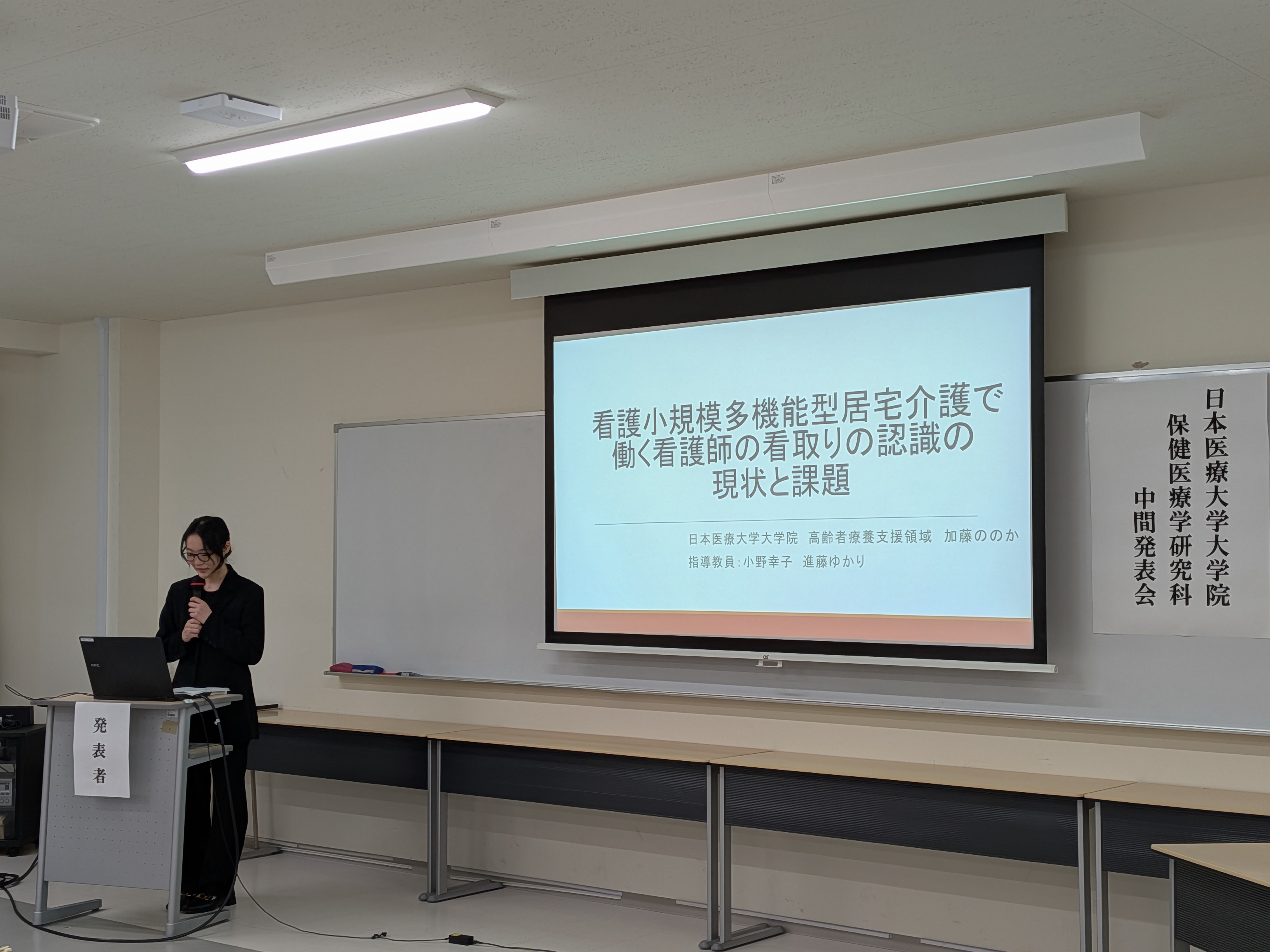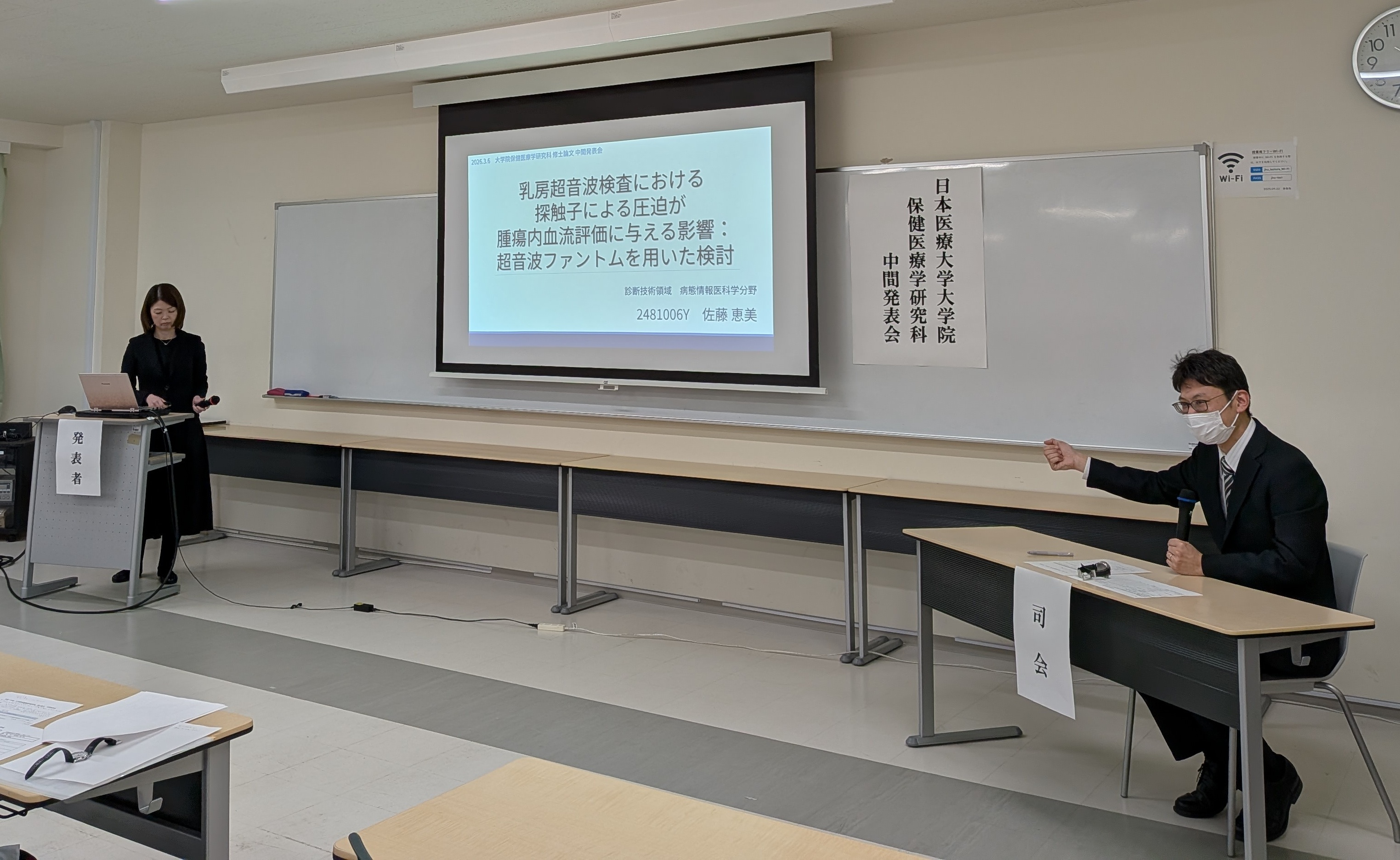 令和8年3月6日(金)、日本医療大学大学院保健医療学研究科において、修士論文の中間発表会を開催しました。本年度は6名の大学院生が登壇し、各自15分間の持ち時間で研究課題の背景、目的、研究方法、これまでに得られた結果および考察について報告を行いました。