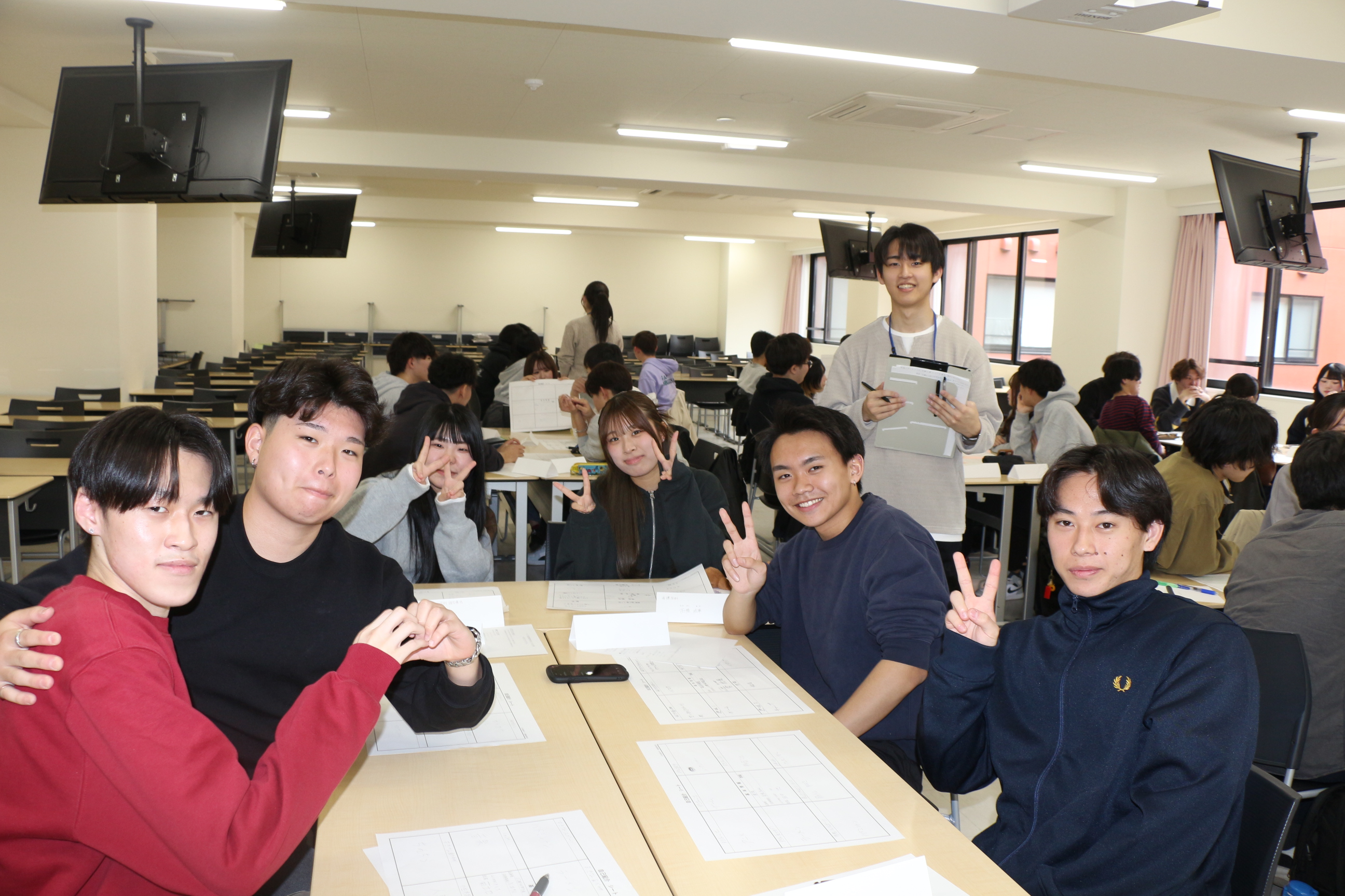午前中は、インタビュー形式による自己紹介から始まり、問題解決型のグループワークを行いました。グループのメンバーと協力して課題解決に取り組みましたが、在学生ファシリテータのもと、どのグループも終始楽しそうに取り組んでいました。