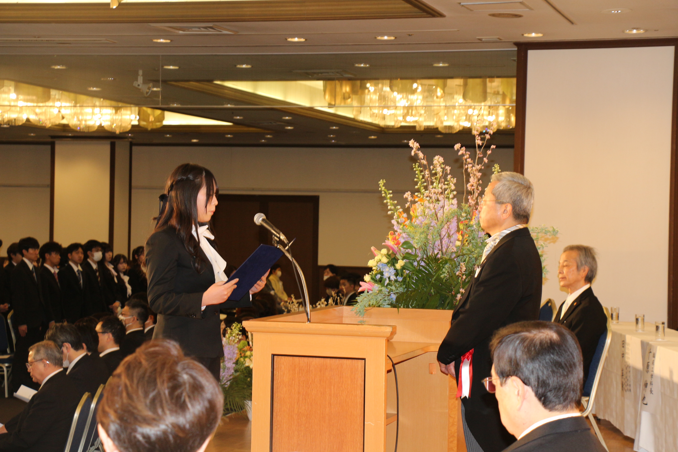 式典では入学生紹介、学長式辞、理事長祝辞、入学生代表宣誓を行い、最後に全員で「誓いの言葉」を唱和し、入学生全員で、人の心の痛みや涙が理解できる職業人となるために、日々努力していくことを誓い合いました。